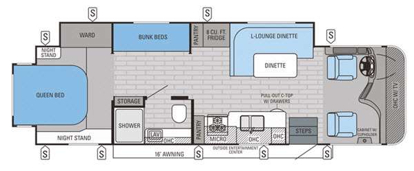 As you enter the motor home, to the left is a double kitchen sink, three burner range, microwave, and pantry. The opposite side of the motor home offers a full wall slide with a l-lounge dinette, refrigerator, pantry, bunk beds, and a wardrobe.