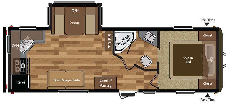 Step inside model 25RKS and see a convenient linen/pantry cabinet just to the left of the entry door. There is a bathroom straight across from the door which provides a neo-angle shower, toilet and sink. A second sliding door inside the bath leads directly into the front master suite which includes a queen bed, dual beside closets, and overhead storage too.