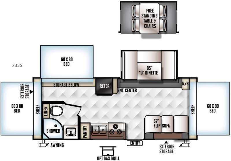 A 67" flip sofa with overhead cabinets is located immediately to your right as you enter. Across, you will find the single slide which has a 85" u-shaped dinette. You may choose an optional free standing table and chairs instead. The refrigerator is right next to the slide out.
